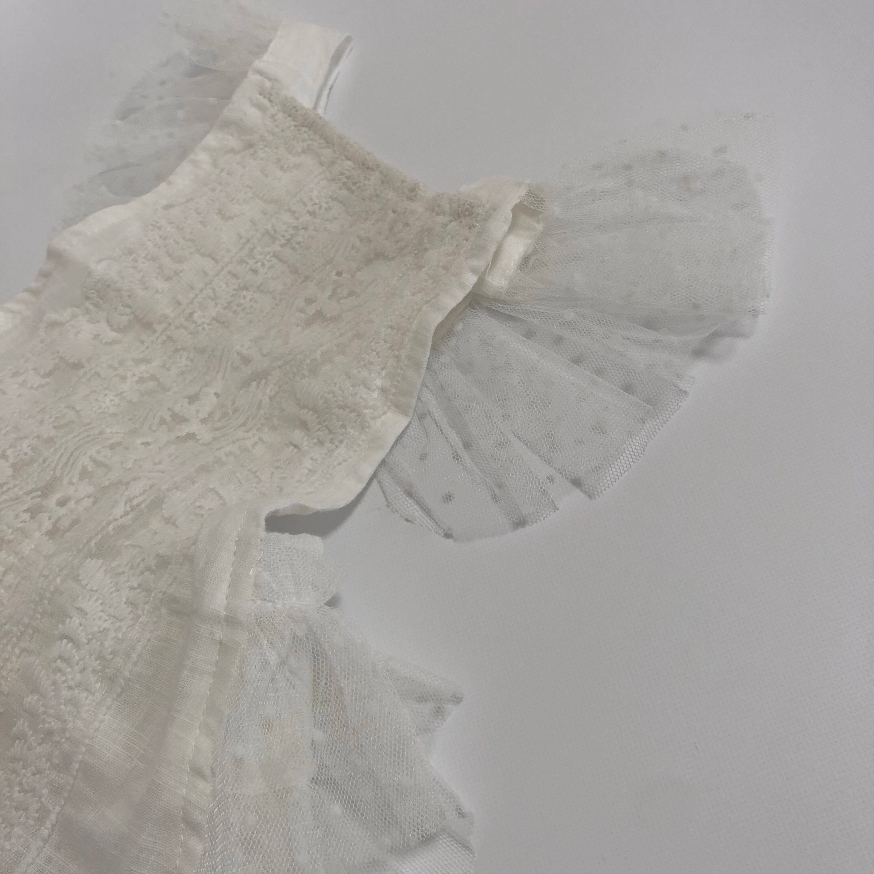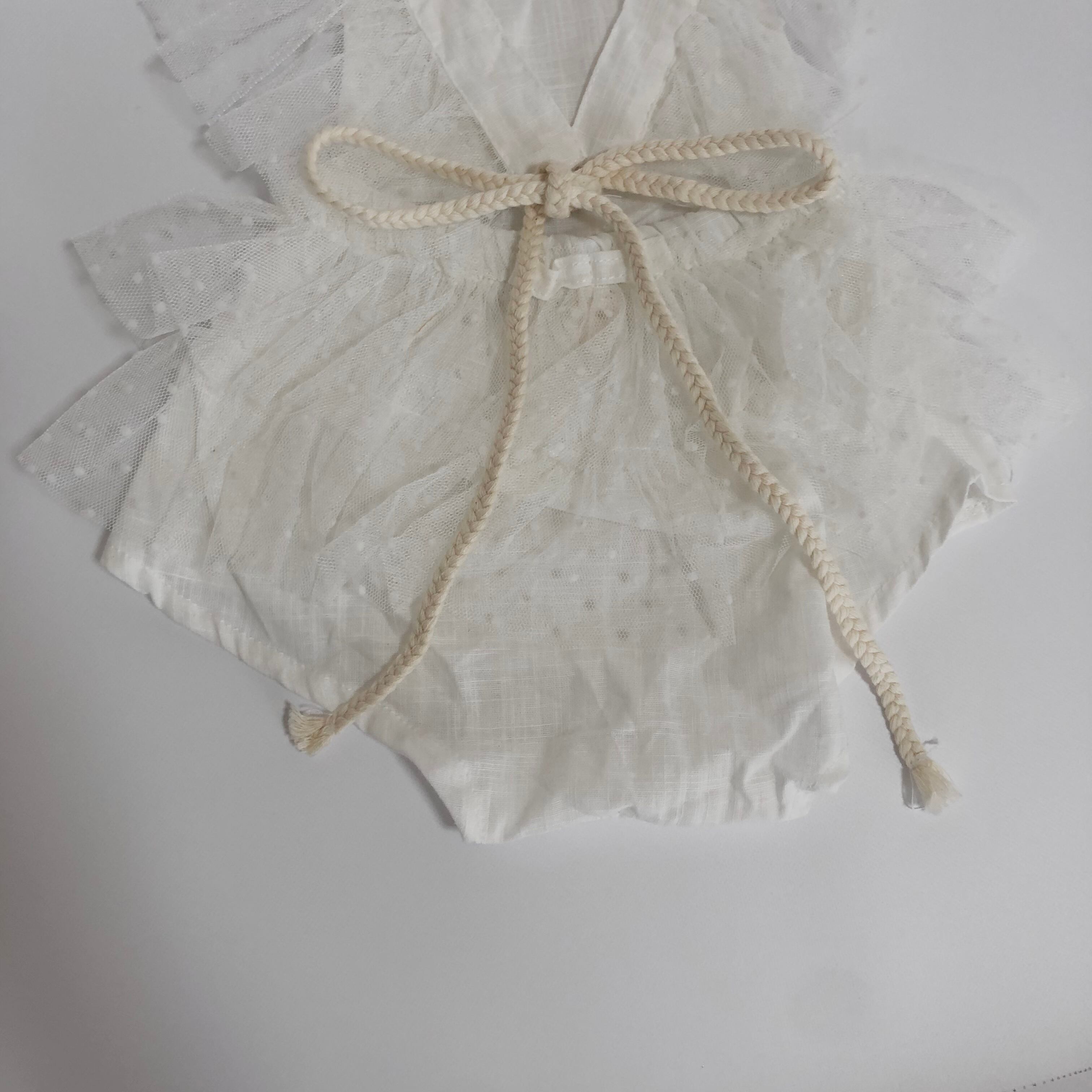 散りばめされたドットのフリルとレースがかわいいロンパース。