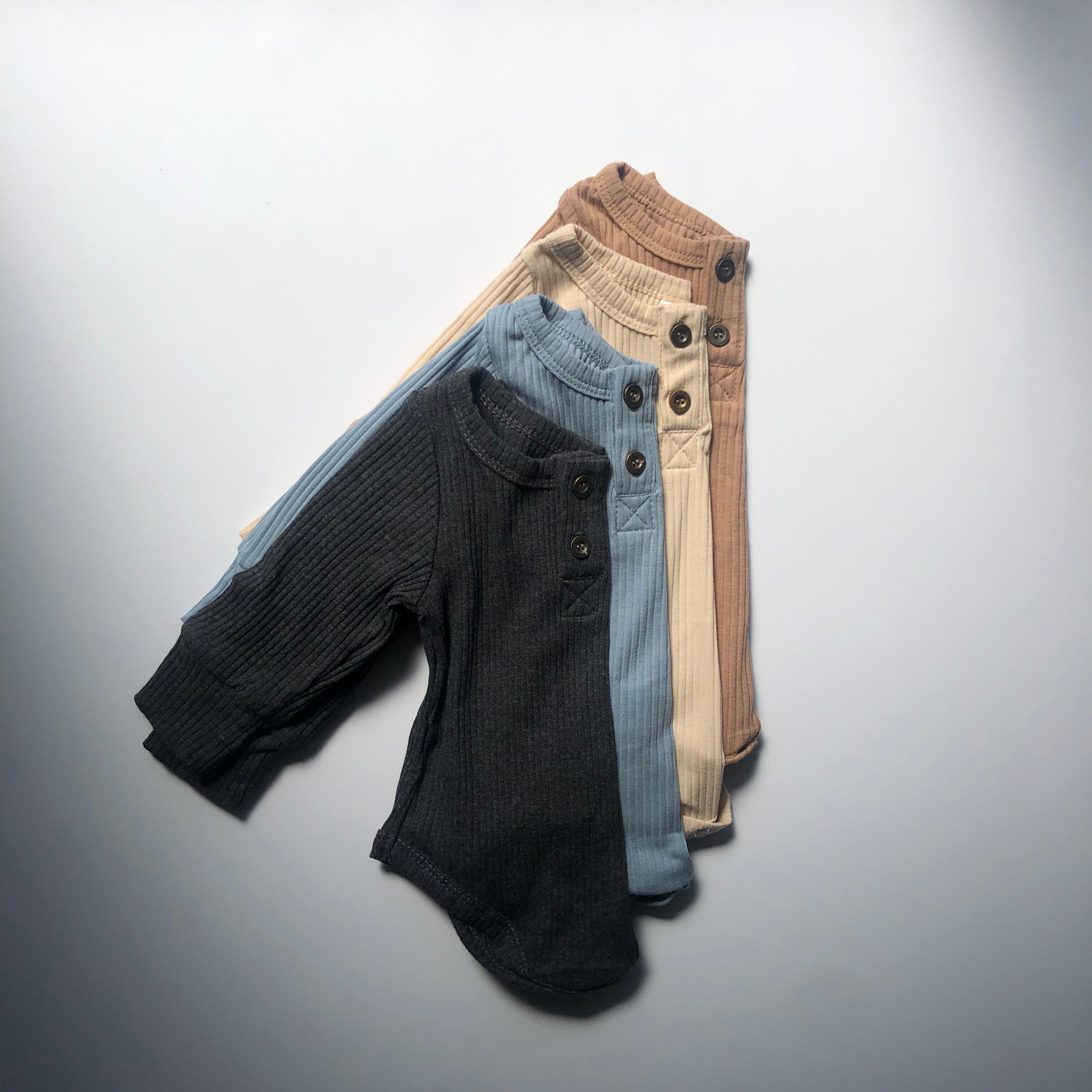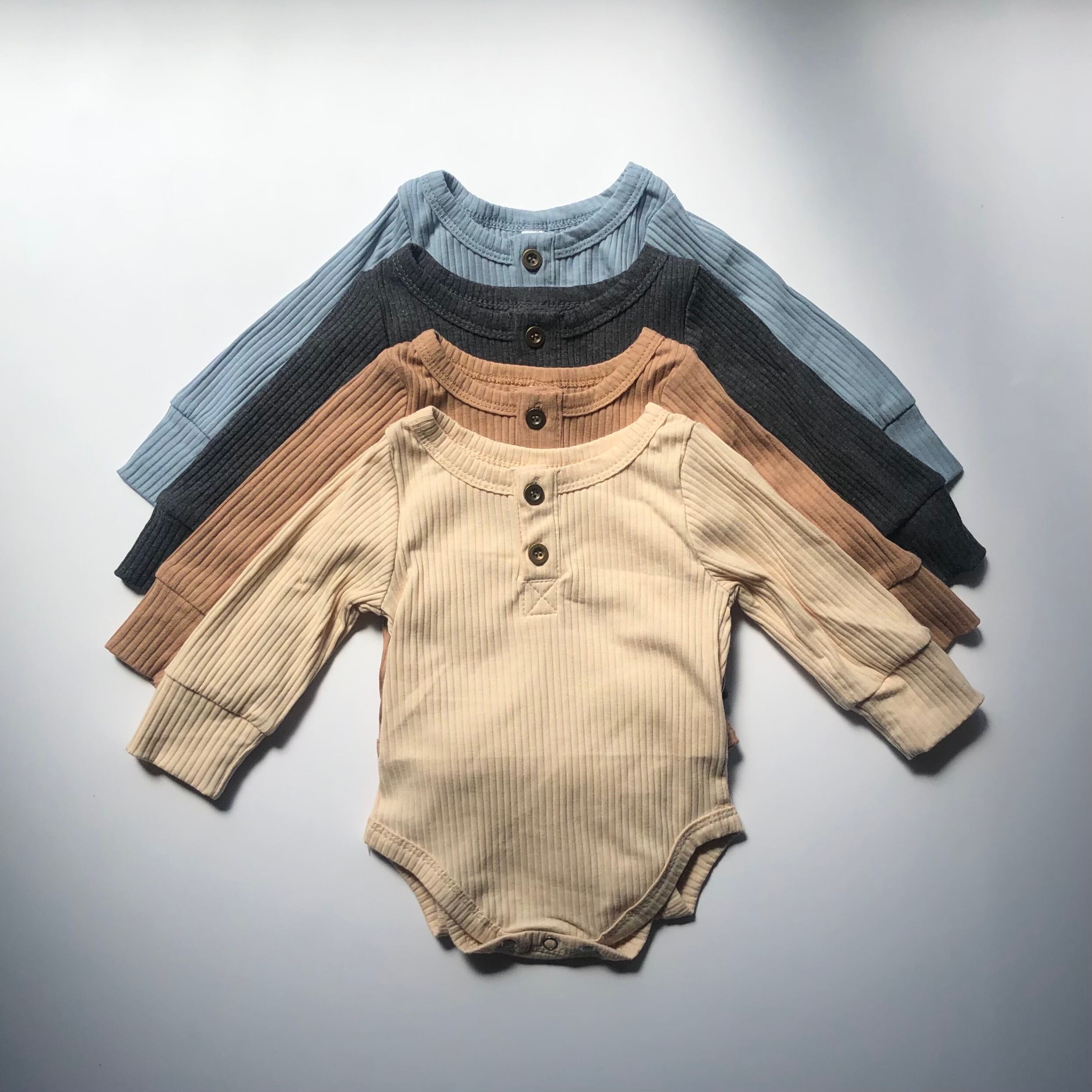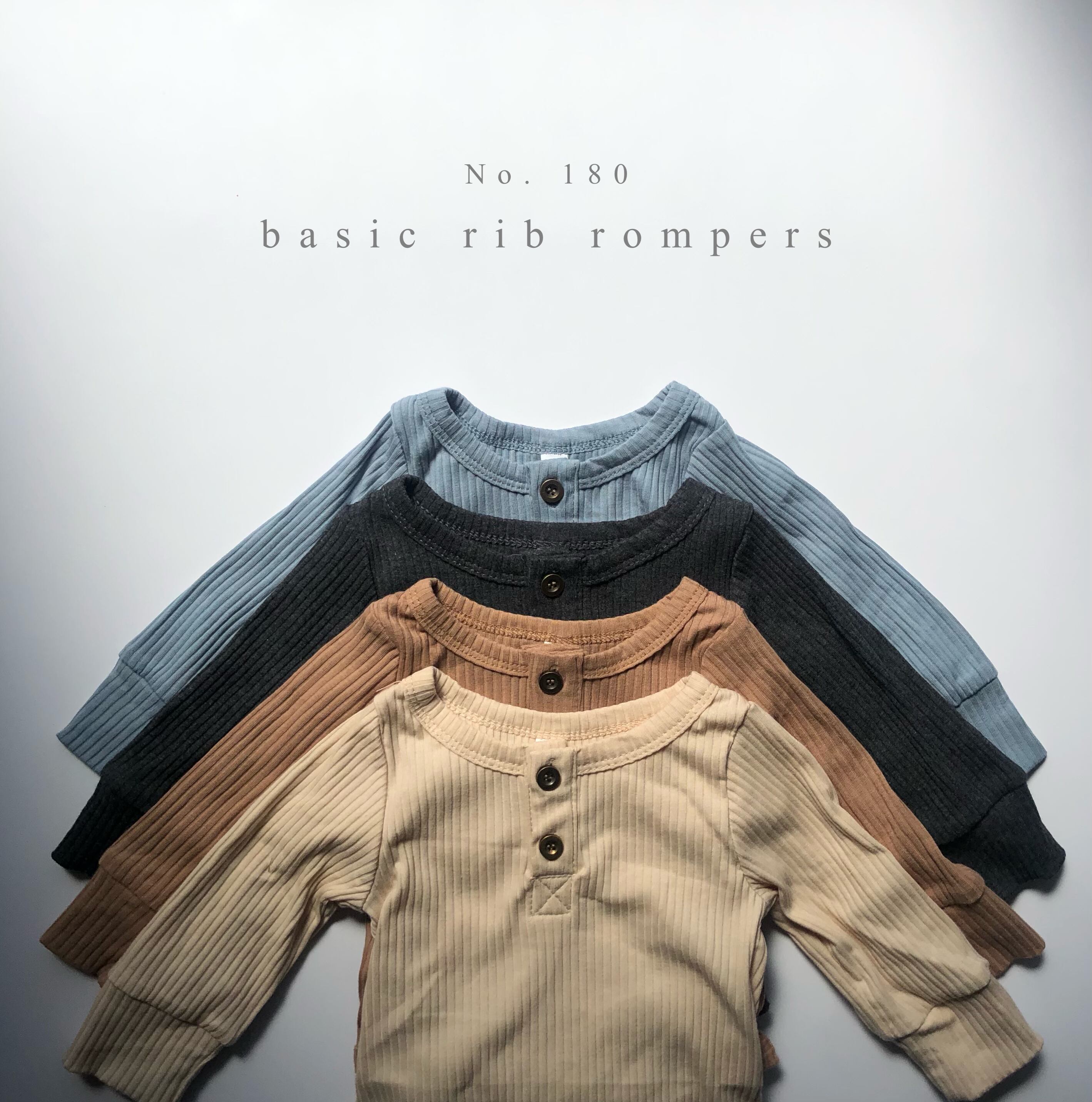 子供服 ベビー服 赤ちゃん服 韓国子供服 リブ ロンパース トップス ベージュ カーキ ブラウン 水色 灰色 グレー 部屋着 ルームウェア Tシャツ 肌着 新生児